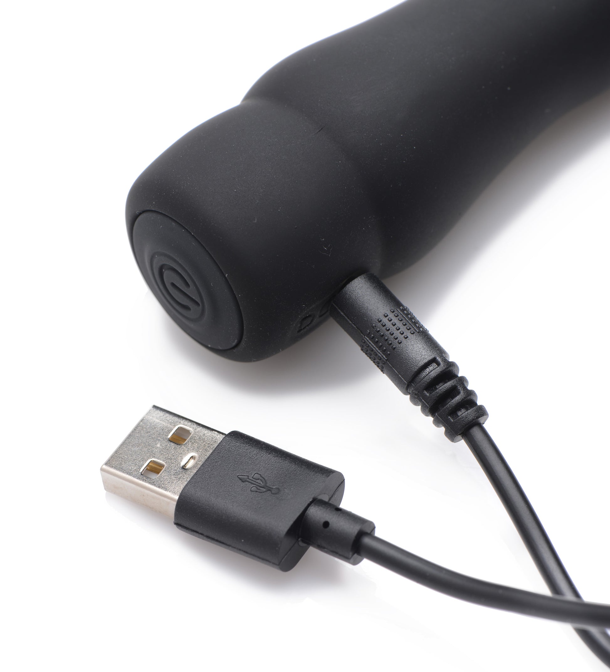 Vibrates with 3 speeds and 13 patterns controlled via the power button on the base of the handle. Recharges via USB, included.