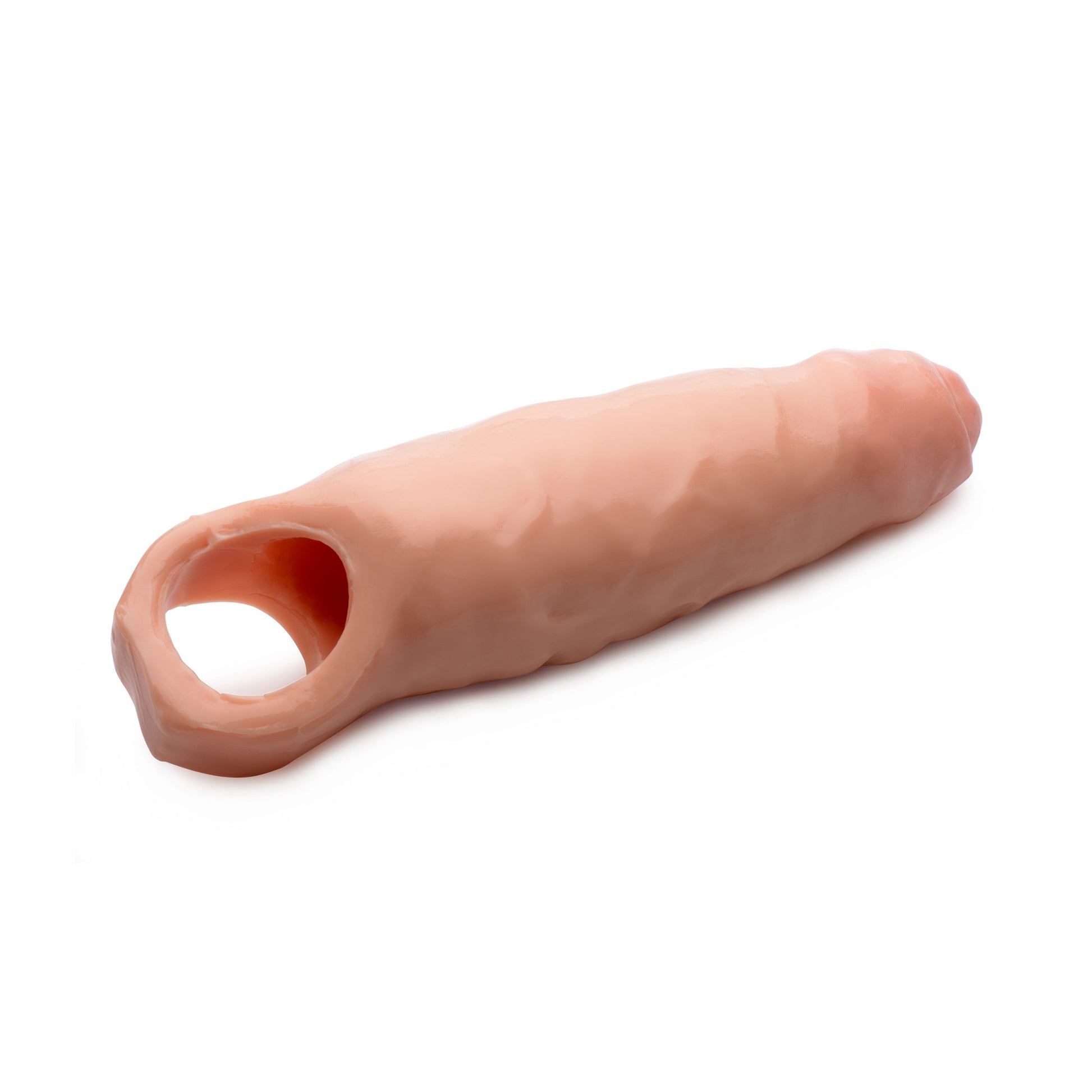 Uncircumcised and unbelievably huge This long, thick shaft slides easily onto your penis so that you can pound your partner with an all-new cock Soft and flexible, but firm, this extender is made of a realistic material that you can both enjoy. The lifelike shape adds to the fantasy as you delve into ecstasy. This enhancement sleeve also allows you to penetrate for longer, with a frictionless internal tunnel and a snug and secure ball-strap. With no shortage of flesh, this slip-on dong is uncut, veiny, and enormous so that you and your partner can explore new realms of pleasure Measurements: 8.5 inches in total length, 6.75 inches insertable. 2.5 inches at widest external diameter. Ball strap is 1.5 inches in diameter, unstretched. Shaft tunnel is 1.25 inches in diameter unstretched. Color: Flesh.