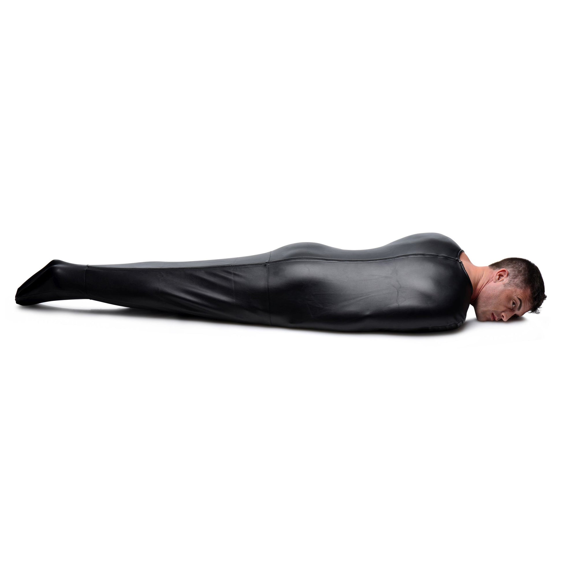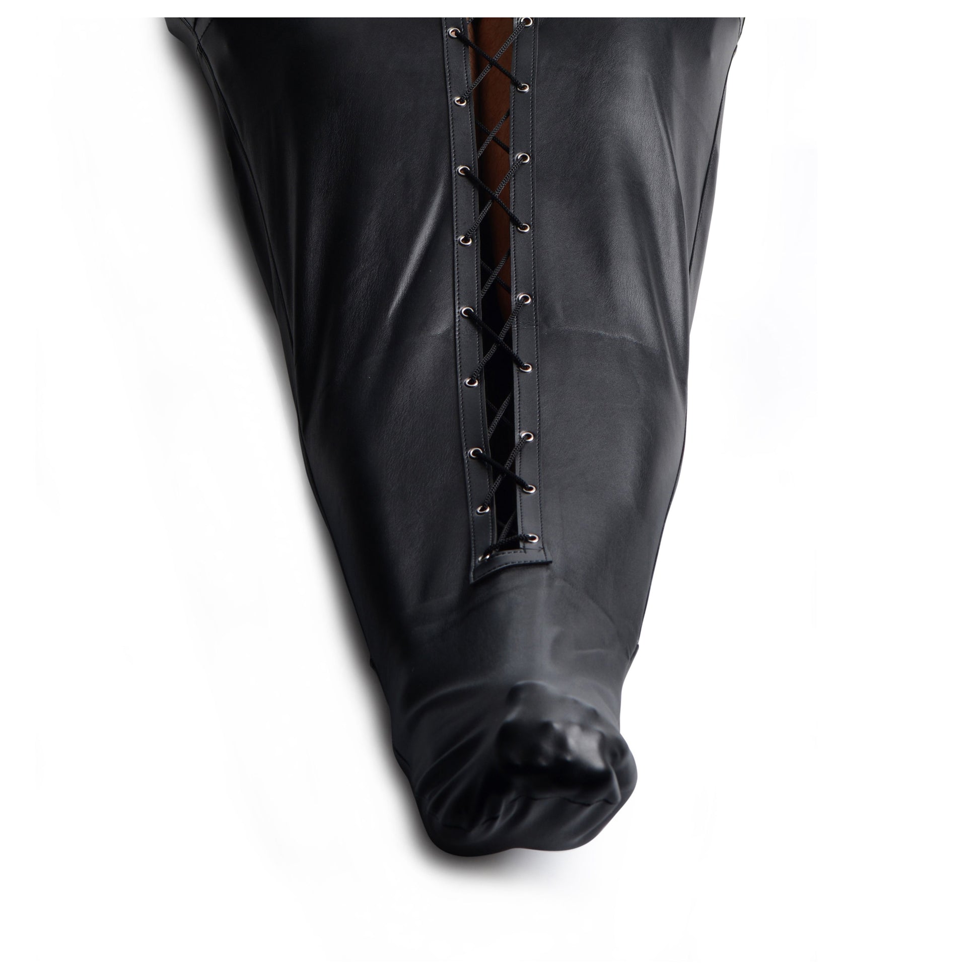 Climb into this luxurious leather-like sleepsack for a full-body confinement that will leave you feeling trapped and vulnerable! Prepare to be immobilized from the neck down when you get zipped up by your partner in this unique bondage. The corset lacing on the front can be loosened or tightened to accommodate your figure, and will also keep your genitals available for play. The soft inner material will ensure your comfort while you are taken to the limits of pleasure!