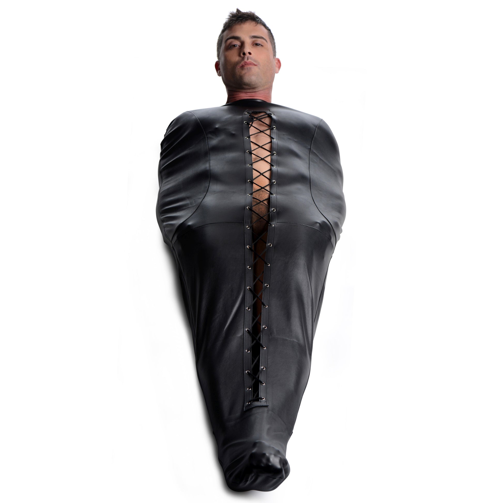 Climb into this luxurious leather-like sleepsack for a full-body confinement that will leave you feeling trapped and vulnerable Prepare to be immobilized from the neck down when you get zipped up by your partner in this unique bondage. The corset lacing on the front can be loosened or tightened to accommodate your figure, and will also keep your genitals available for play. The soft inner material will ensure your comfort while you are taken to the limits of pleasure Measurements: 61.5 inches in total length. Zipper is 49.5 inches in length. Foot area is 11 inches in length. Neck hole is 20 inches in circumference. Shoulders are 21 inches across. Chest circumference adjusts upwards from 42 inches with lacing. Waist circumference adjusts upwards from 38 inches with lacing. Knees circumference adjusts upwards from 28 inches with lacing. Material: PU leather. Color: Black.