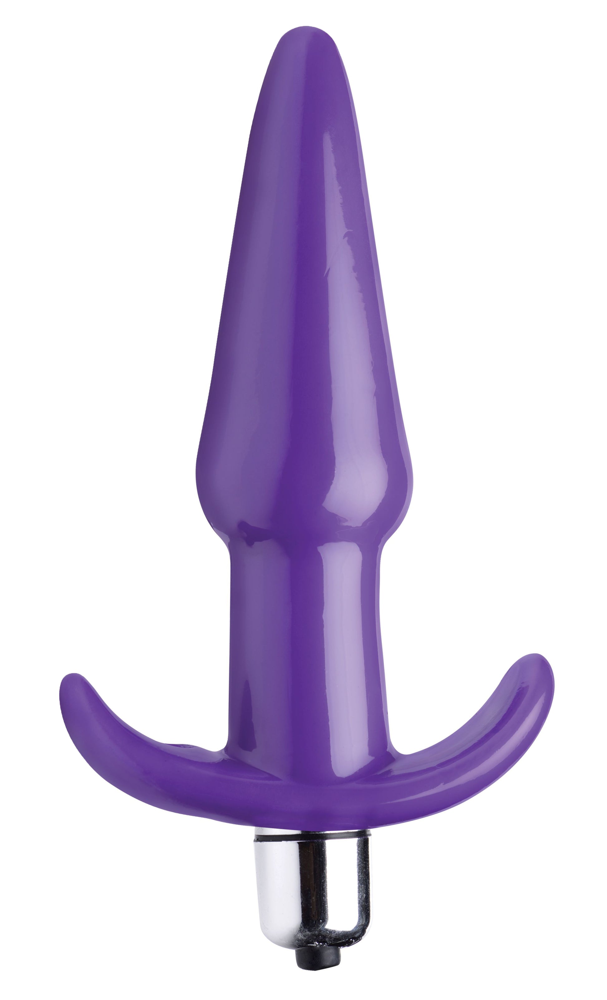 The thrillings thrums of this smooth butt plug are perfect for an anal amateur or a booty boss! A tapered tip coupled with the sleek material allow for a comfortable penetration, while the narrow base is shaped perfectly to fit between your cheeks. A one-speed bullet is included that can be inserted at the bottom of the plug. With the simple push of a button you can fill your hole with humming heaven. It is even waterproof to allow for wet, hot fun in the shower or jacuzzi! This firm, but flexible butt plug is phthalate-free and compatible with silicone and water-based lubricants. Clean with mild soap or a toy cleaner. Measurements: Plug is 4.8 inches in total length, 4.5 inches insertable length, 1.25 inches maximum diameter, .75 inches minimum diameter. Bullet is 2.3 inches in length, .7 inches in width. Material: TPE, ABS plastic Color: Purple Note: Bullet requires 3 LR44 batteries, included